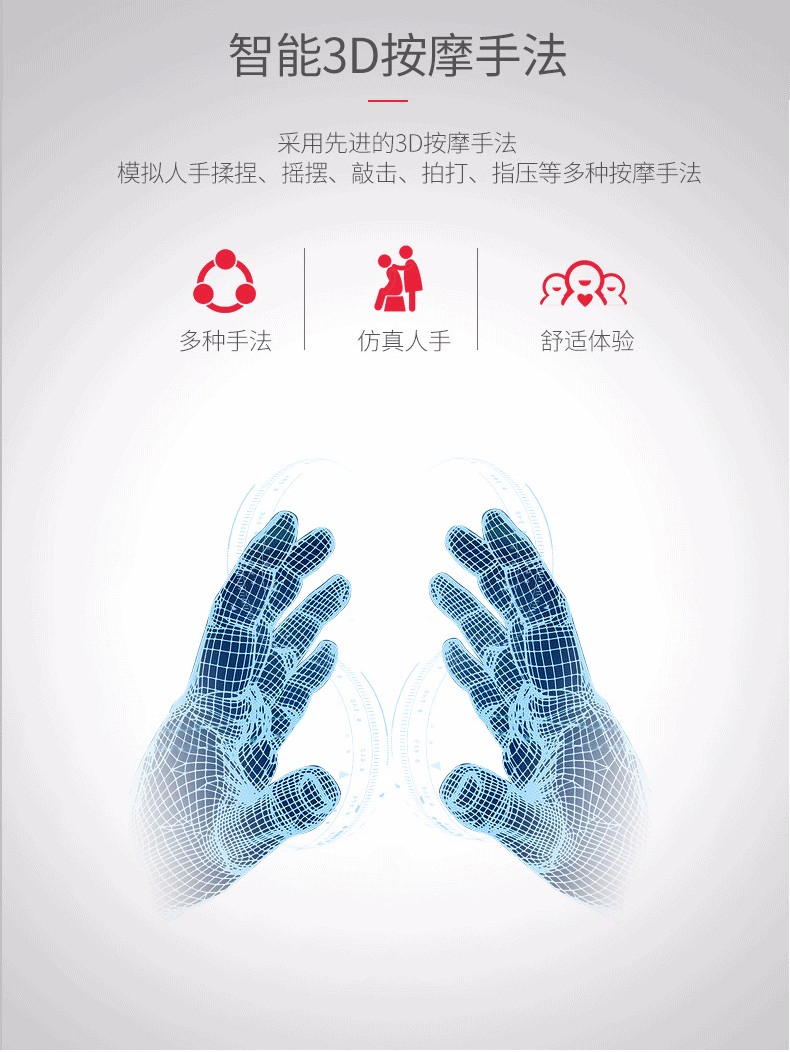 额定功率:95w 额定电压:220v50hz 定时:10/20/30 尺寸:椅背直立:112.5*68.5*111.5cm 椅背后仰:140.8*68.5*77cm 净重:约50kg 专利东方手感超薄按摩机芯 超长L型曲线导轨 按摩轮加热按摩 座部、腿部气压按摩 零重力、音乐按摩放松身心 时尚外观 家居首选
